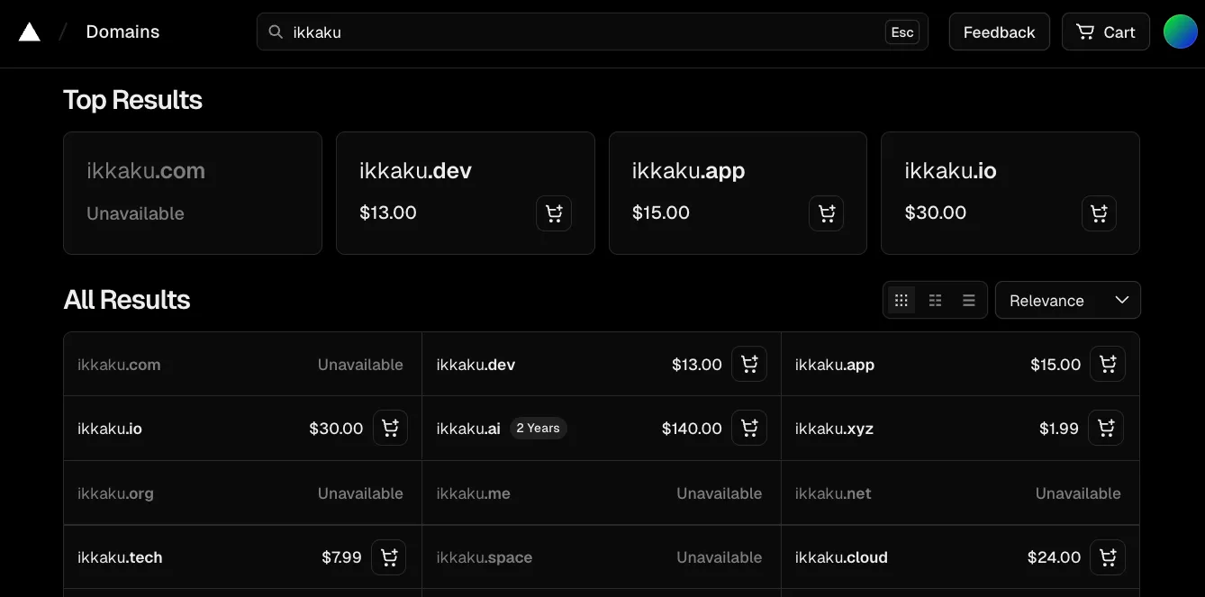 検索・購入できるサイトはたくさんあるのですが、僕は Vercel Domains がおすすめです。